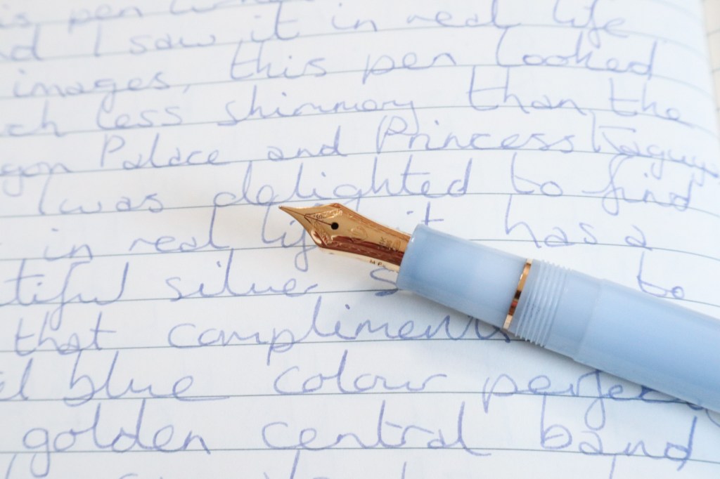 Overall though, I really like this pen, and I’m glad to have it in my collection. And not just because of fountain pen FOMO! I like how unique this pen feels to write with, and the Grateful Crane colour is incredibly pretty. This is definitely one of the pens in my collection I could just sit and look at, watching the sparkles catch the light!