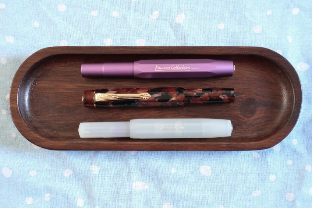 The acrylic plastic definitely has a more robust feel to it than the regular plastic Kaweco Sports, but I’m not sure it’s enough to justify the huge jump in price tag. Although I suppose you’re paying more for the pattern of the acrylic, and the uniqueness of each individual pen.