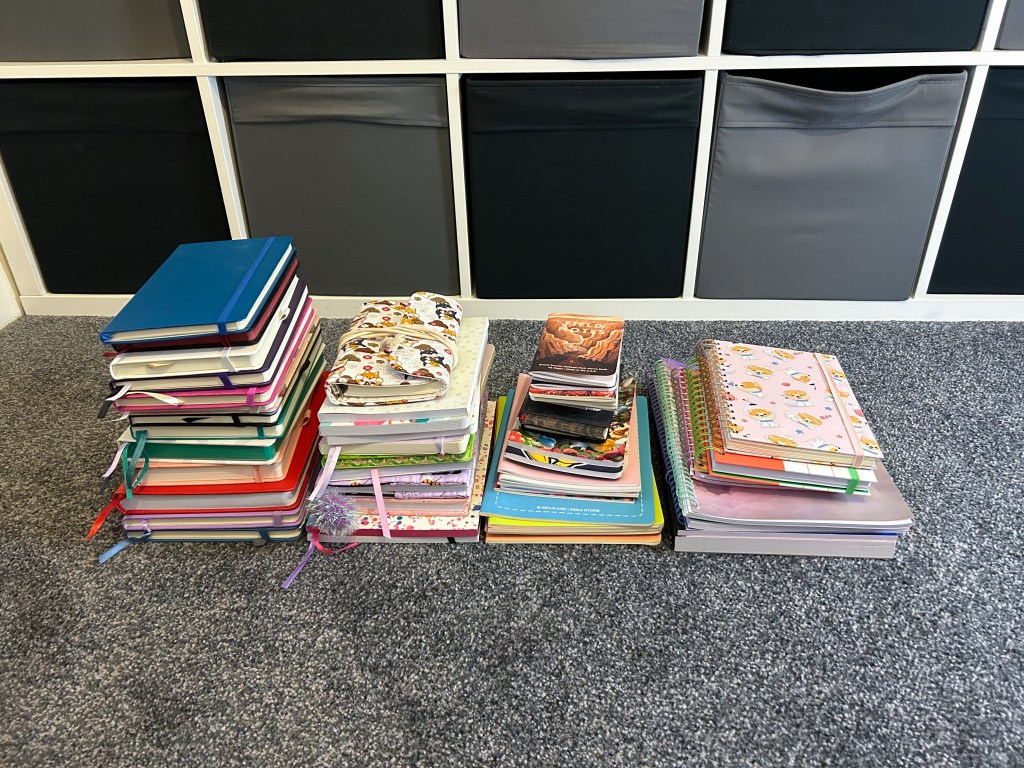 So I decided it was time to face the ugly truth of my hoarding tendencies. I went through all the drawers in my office and pulled out every notebook I could find, and separated them out into categories. The used ones I filed away back in the drawers, whilst ones that hadn’t been written in I put to one side. The ones where I’d only used a few pages I ended up pulling those pages out, and then moving them into the empty notebook pile. I then stacked all the empty notebooks on the carpet and started counting.