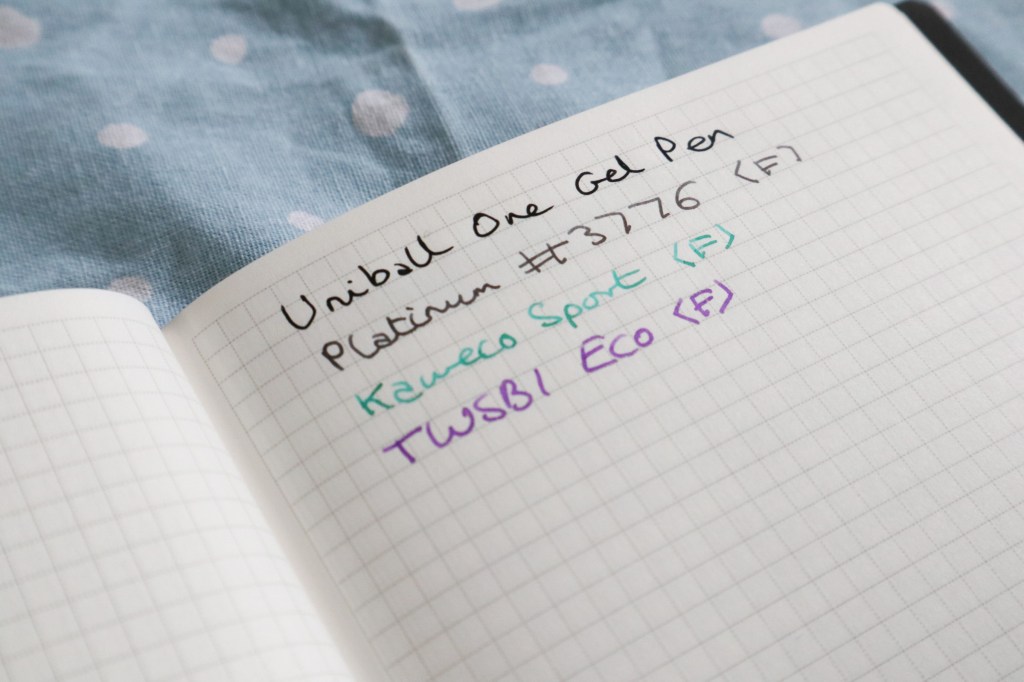 You can see here what I wrote, and then the level of ghosting on the back of the page…and I have to say, I’m impressed. I’d expected the Platinum #3776 with a fine nib to be OK, but I was pleasantly surprised to find the thicker Western fine nibs inked with bright colours were also OK. Even the bold gel ink of the Uniball One barely showed, and it certainly didn’t bleed through!