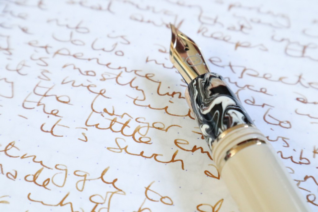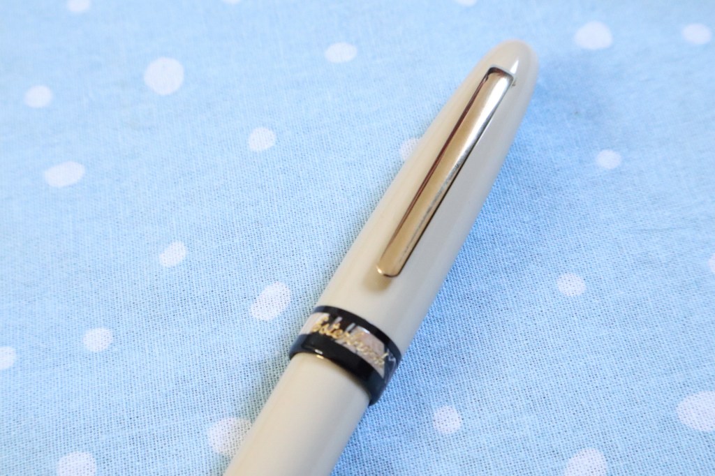 And then there’s the pen…it’s so stunning! The beautiful creamy beige of the body of the pen contrasts nicely with the deeper brown of the swirly resin in the cap band and the section of the pen.