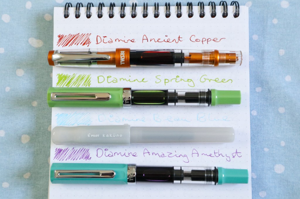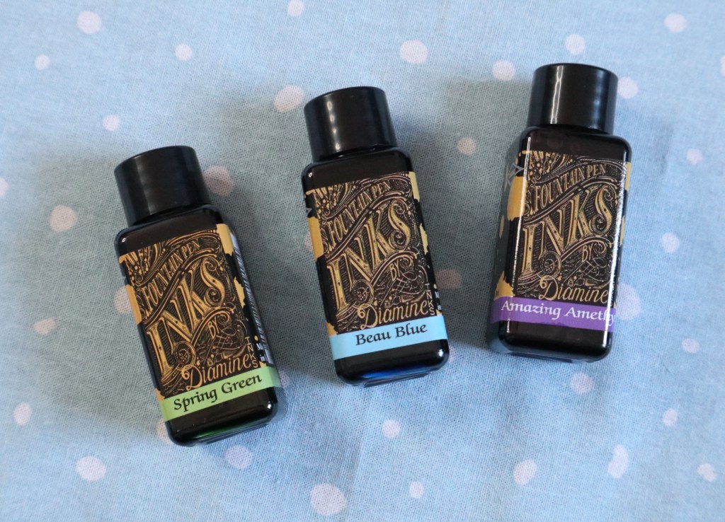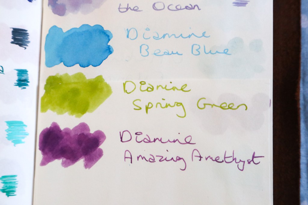 The ink in the Matcha TWSBI Eco is Diamine Spring Green, which I bought along with the pen. Every time I shop at Cult Pens I have to throw at least one Diamine 30ml bottle of ink in my basket, because even without discount they’re so cheap. So this time I bought three: as well as Spring Green I got Beau Blue and Amazing Amethyst.