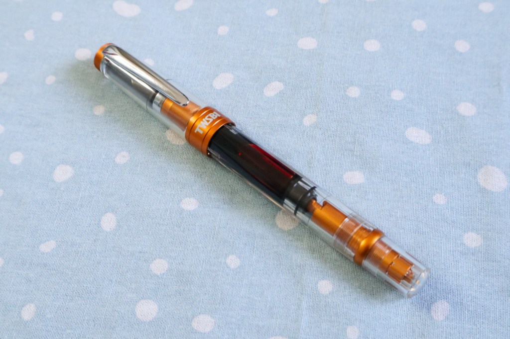 As tempted as I was to put a bright orange ink in this pen, I opted in the end for Diamine Ancient Copper, an ink I love, but haven’t used in a long time. And it’s a nice combination!
