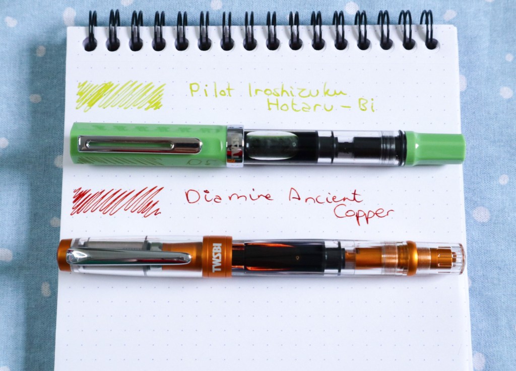 As I spoke about in an earlier post, I got two new fountain pens this month in the Cult Pens birthday sale: the TWSBI Eco Matcha Green, and the TWSBI Diamond 580 ALR Sunset. As my newest acquisitions I’ve been using them a fair bit, and have already had to re-ink the TWSBI Eco Matcha: I switched from Diamine Spring Green to a new ink I got, Pilot Iroshizuku Hotaru-Bi.