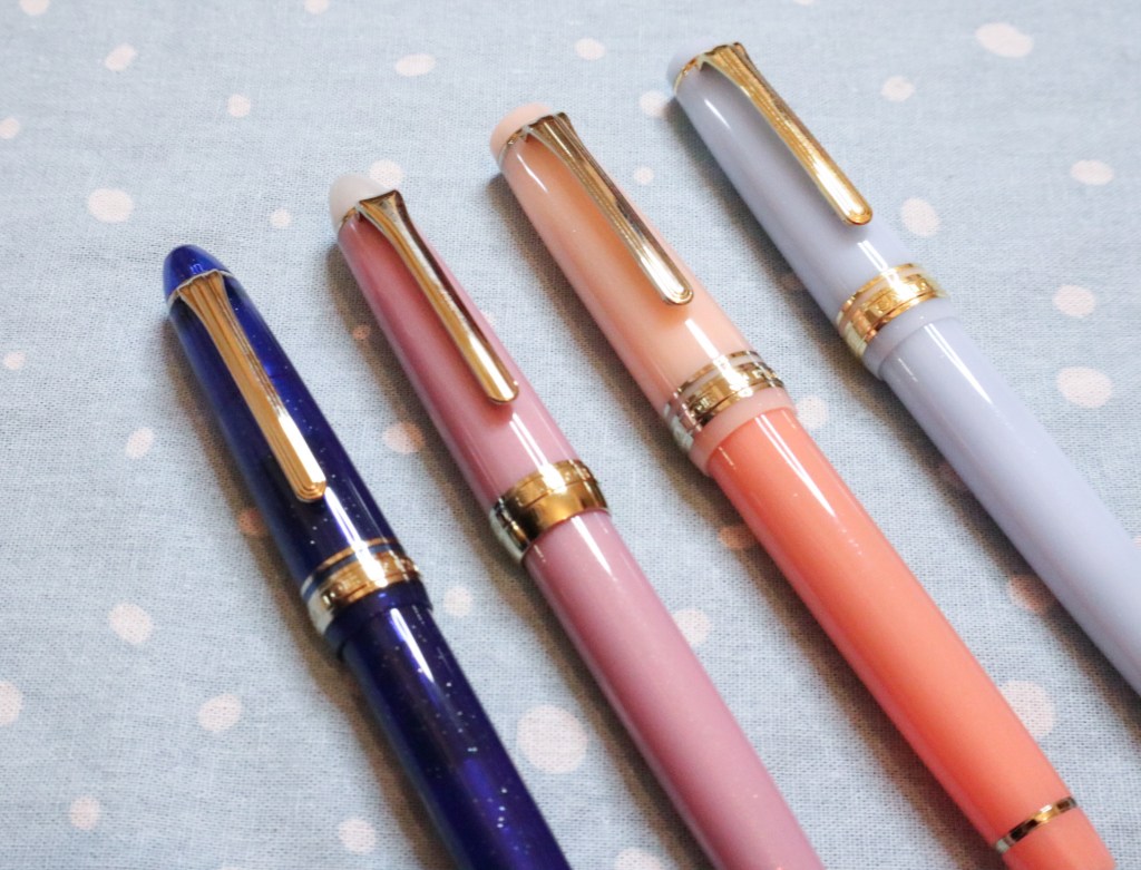 Before fountain pen day my collection consisted of a Sailor Shikiori Tsukuyo-no-Minamo Yozakura (with a fine steel nib), a Sailor Pro Gear Slim Grateful Crane (with a medium fine gold nib) and a Sailor Pro Gear Cantaloupe from the Smoothie series (with a fine gold nib – and I’m not counting that as a double up, because gold nibs are different than steel!).