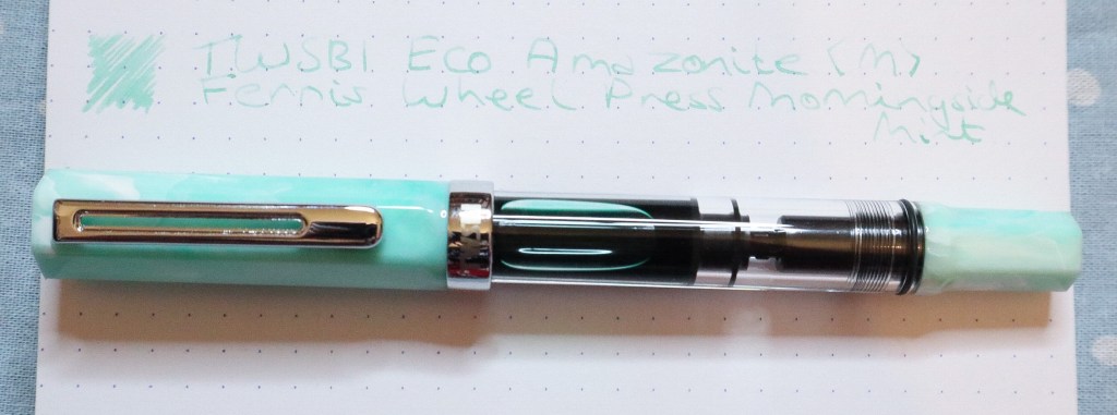 It’s really pretty, and since I bought it with a medium nib, I feel like I’ve finally found the perfect pen for an ink I’ve had for a while, Ferris Wheel Press Morningside Mint. I love the colour of this ink, but I’ve previously struggled with the legibility of it in some of the finer nibbed pens I tend to favour. However, it works great in this pen (not that it looks that legible in the photo!) and the colour is a perfect match.