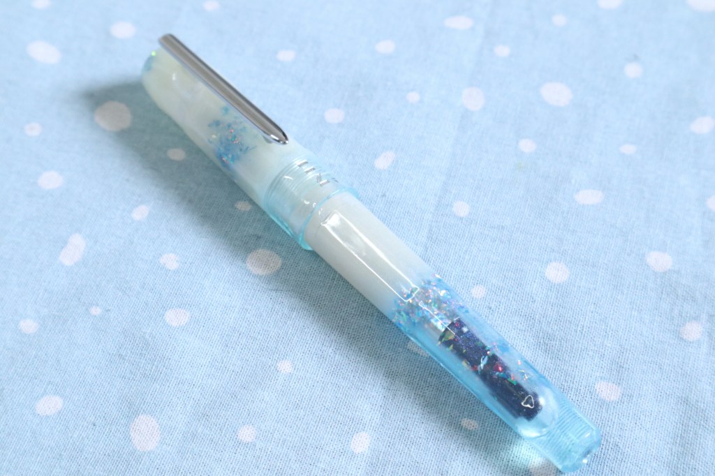This pen is probably the most beautiful pen in my entire collection, with it’s combination of iridescent, glittery white and transparent blue sections full of chunky glitter. And not only is it stunning, but the Talisman model is incredibly comfortable in my hand, and the medium nib is absolutely perfect.