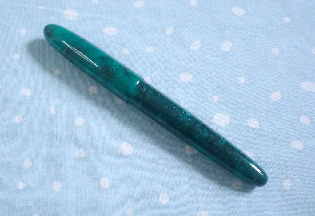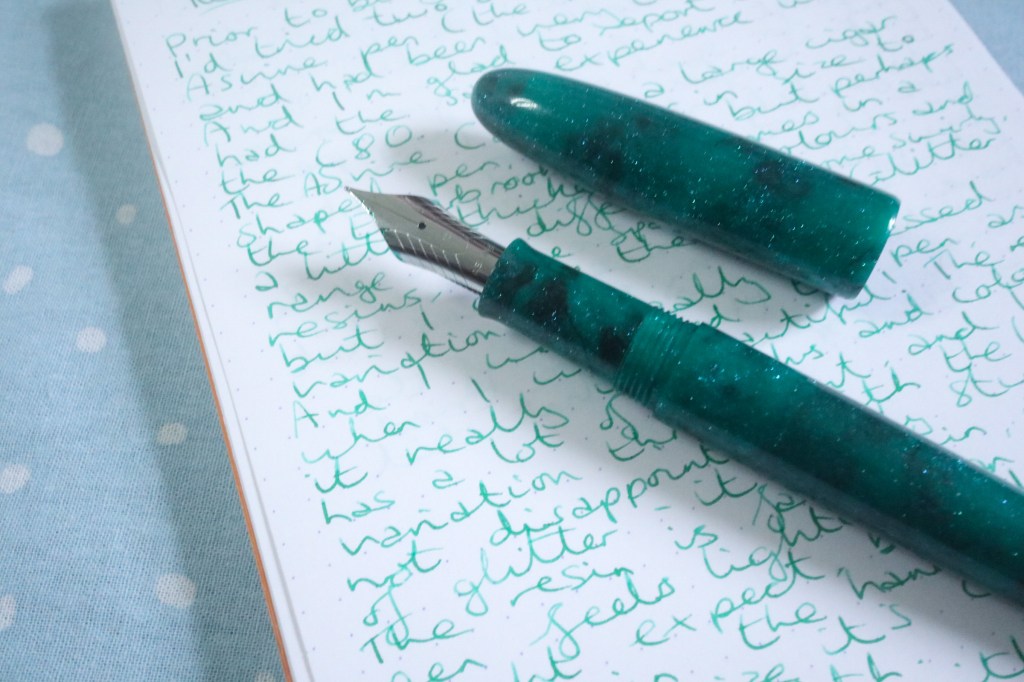 The Asvine C80 is a large cigar shaped pen, similar in size to the Esterbrook Estie but a little thicker. It comes in a range of different colours and resins, but I chose the Green Glitter variation, which is a dark, cool green colour flecked with green sparkles.