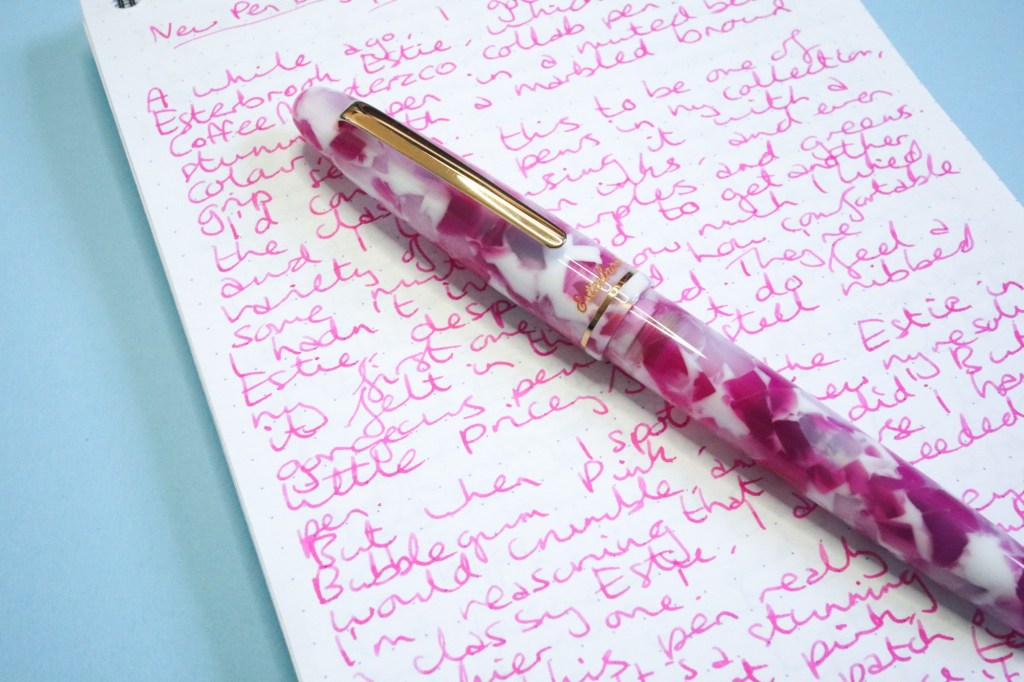 In terms of inks, I immediately decided to pair the Bubblegum Estie with the most obnoxiously bright pink I had, which was Diamine Hope Pink. And I love this eye-popping combination! I got the medium nib this time (my other Estie is fine), as I felt like this would be a pen where I’d want to be a lot more experimental with my inks. But right now I’m pretty satisfied with this matchy-matchy pen and ink combination!